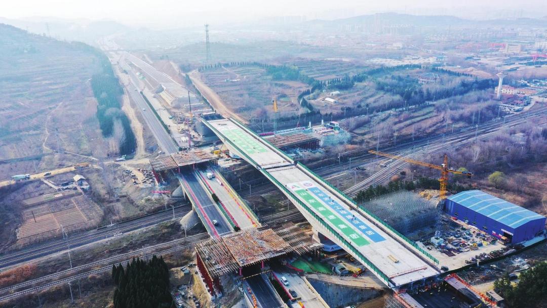 上跨蓝烟铁路转体桥是烟蓬改扩建项目的重要控制性节点工程,采用三跨预应力混凝土变截面连续箱梁结构,跨径布置为80米+125米+80米,单侧转体长度122米,转体段总长244米,单个转体重量1.86万吨,刷新了省内同类型高速公路转体桥的长度纪录。