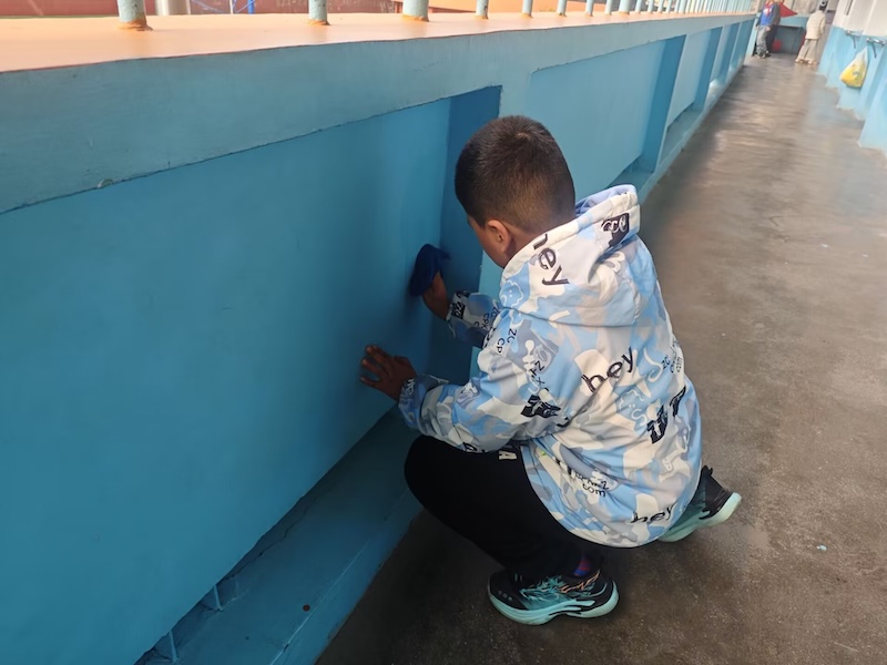 活动现场,专业工人细致打磨、均匀粉刷,让斑驳墙面重焕洁白。师生们分工协作,擦拭门窗、清洗窗帘、清理杂物、清扫死角,不放过一处细节。大家干劲十足,用汗水为校园“梳妆打扮”,展现出爱校如家、团结协作的良好风貌。