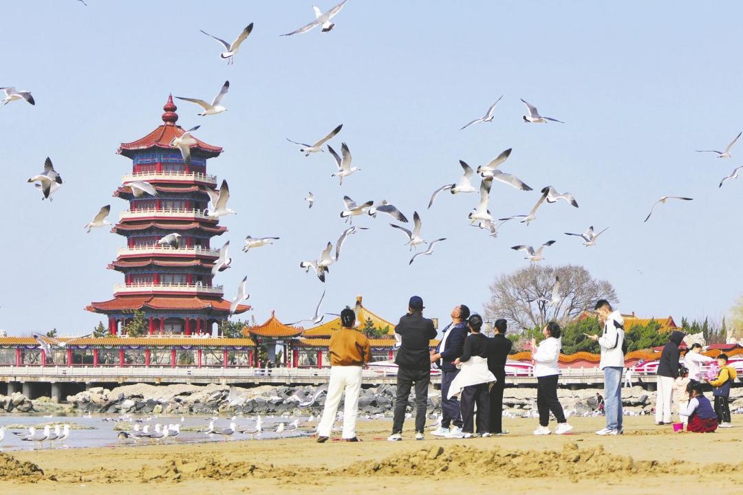 3月28日,在烟台市蓬莱区八仙过海景区沿岸,众多海鸥飞舞嬉戏,引来游客观赏与互动,为春日海滨增添了灵动生机。 记者 唐克 摄