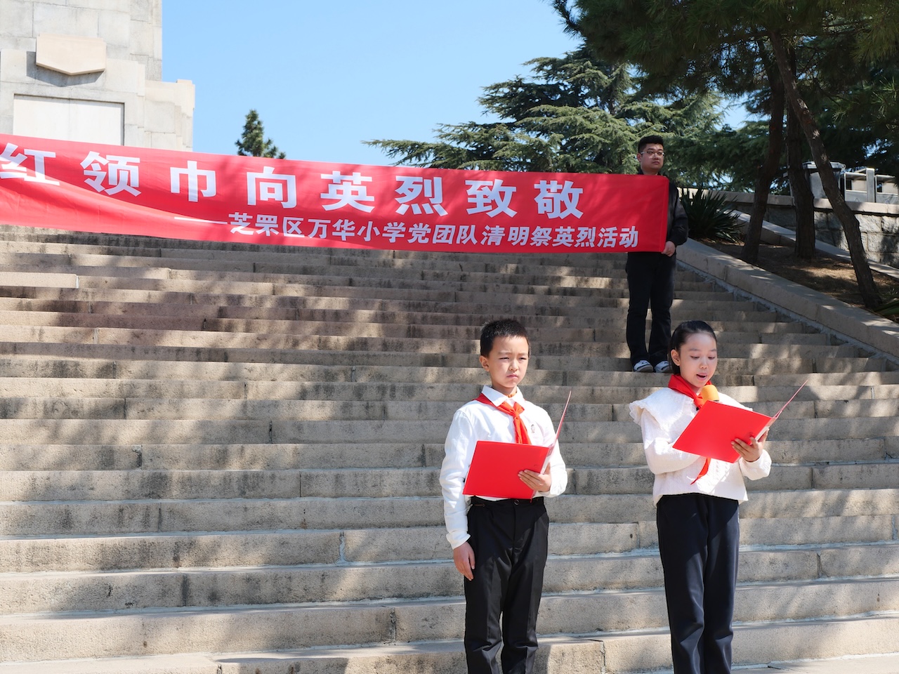 活动现场庄严肃穆,少先队员们佩戴鲜艳的红领巾,怀着崇敬之心列队肃立。活动中,少先队员代表为学生们讲述了英烈们的英雄故事,一段段感人至深的事迹打动着在场的每一个人,让大家深刻感悟今天的幸福生活来之不易。