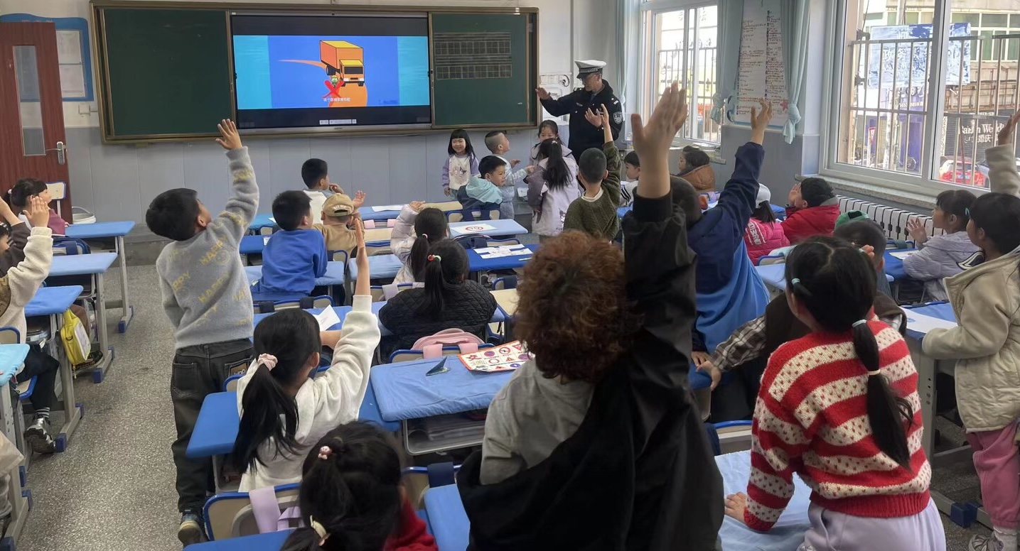 为打破传统课堂的枯燥感,活动特别设计了两大互动环节——模拟交警指挥手势演练与情景问答游戏。民警亲自示范标准的交警指挥手势,孩子们积极举手模仿,在动手实践中直观理解手势指令;情景问答环节围绕“如何安全过马路”“乘车时的注意事项”“骑行安全要点”等核心问题展开,孩子们踊跃发言,结合自身生活经验分享想法,在互动交流中深化对知识的理解。