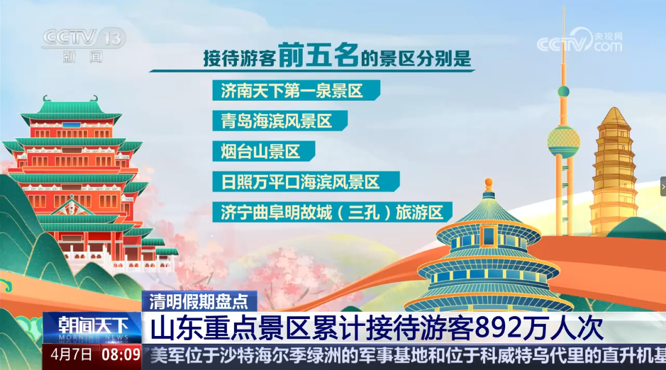 清明假期,山东省重点监测的200家旅游景区累计接待游客892万人次,旅游经营收入4.9亿元,同比分别增长7.1%和6.9%。