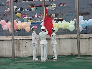 随后,海军航空大学国旗班入场,全场肃立,升国旗、奏唱国歌。鲜艳的五星红旗在晨光中冉冉升起,两地师生面向国旗行注目礼,爱国之情在心中激荡。于庆洋副校长致开幕词,裁判员代表王冰宣誓,运动员代表李仲维宣誓。