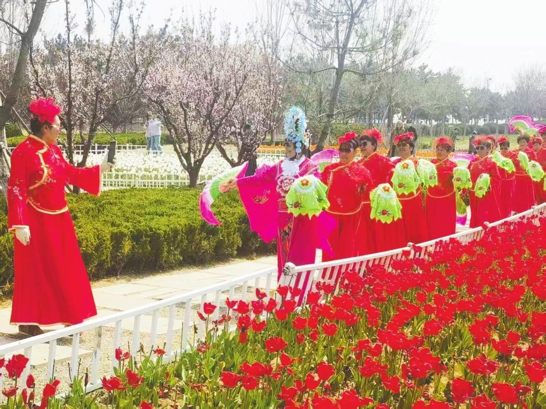 人群中,记者留意到一支特殊的“队伍”——十余位身着统一红色传统服饰的阿姨,正沿着花径缓步而行,她们手持绿色绣花扇、粉色绸伞,头戴精致花饰,在郁金香花丛边排成队列,随着音乐翩翩起舞。领队的张阿姨介绍,这是社区组织的“春日采风”活动,“姐妹们准备了半个月,既要拍出好照片,也要做文明赏花的表率。”