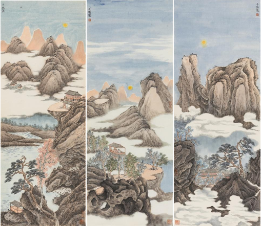 其作品山水气息静穆清雅,意境幽深。用笔细腻松灵,设色清润温雅,融传统青绿法度与现代构成意识于一体,营造出可游可居的林泉之趣,展现了女性艺术家对自然静谧之美的独特感知和诗意表达。