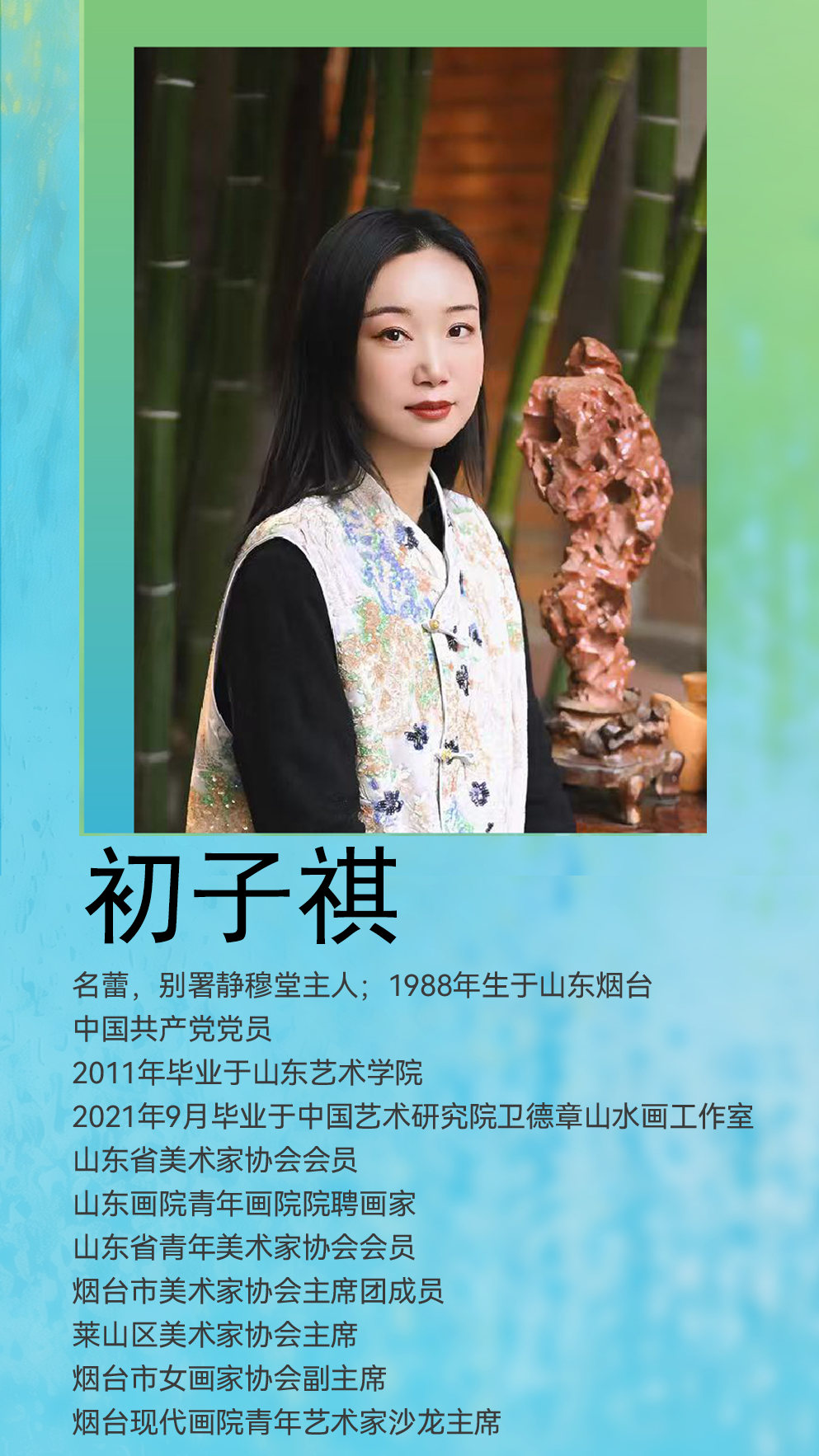 子祺的画静谧悠远,高古恬淡。一山一水可窥其心境,一草一木能悟其志向。近年于山水、人物均用功颇深,虚心求教于名师,孜孜矻矻,宵衣旰食,画艺精进。其虽桃李年华,却勤耕不辍,未来大有可期。