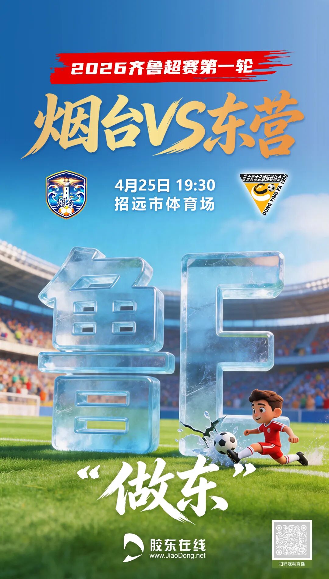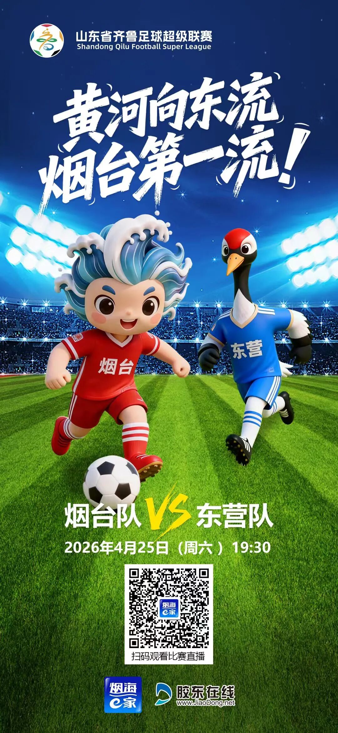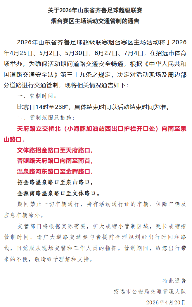 4月25日,2026齐鲁足球超级联赛烟台队首个主场赛事将在招远市体育中心体育场正式开赛。