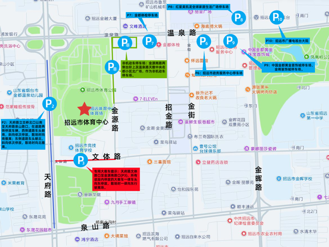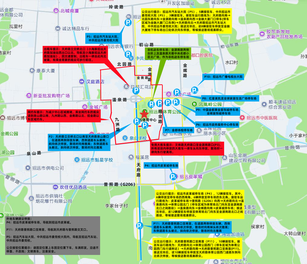 P4停车场:招远市皮革城周边,12辆接驳车。其中,6辆停放至停车场的西南角、6辆停放至停车场的东北角。接驳车运行路线为:皮革城停车场→普照路(G206)向西→天府路向北→温泉路向东→体育公园北门(停车区域为体育场北门向东至金源南路北口之间路段)→温泉路向东→金晖路向南→皮革城停车场;接送完毕后,该12辆接驳车停放至体育场北门向东至金源南路北口之间路段,等候接送散场观赛群众。