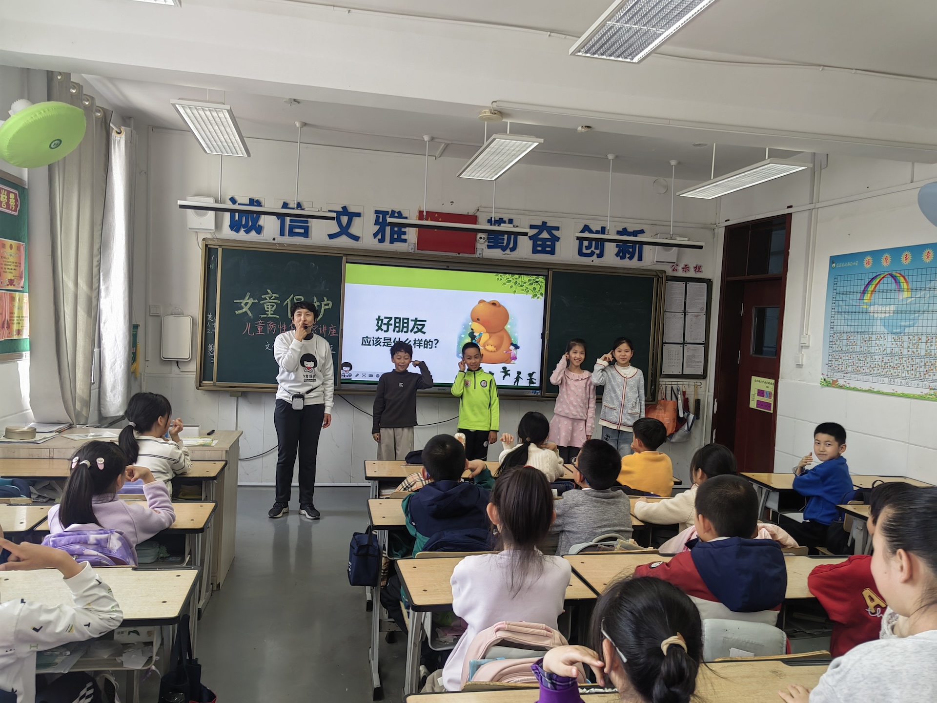 课堂上,讲师注重互动性与趣味性,围绕“好朋友应该是什么样的”展开趣味提问,邀请学生上台分享观点;结合卡通案例,拆解“分辨和防范性侵害”的具体技巧,从“不与陌生人独处”“不接受陌生人物品”到“遇到危险勇敢求助”,逐一讲解避险要点。学生们在轻松愉悦的氛围中逐步掌握自我保护的方法。