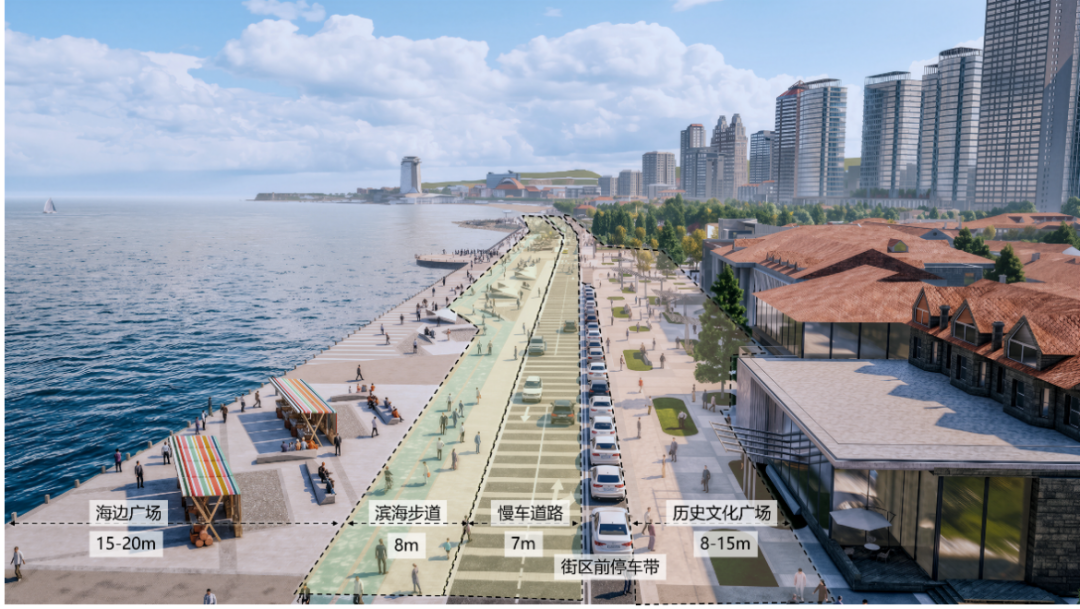 海岸路历史上曾为通车路段。本次方案在尊重历史格局的基础上,通过更新改造,恢复其通行功能。
