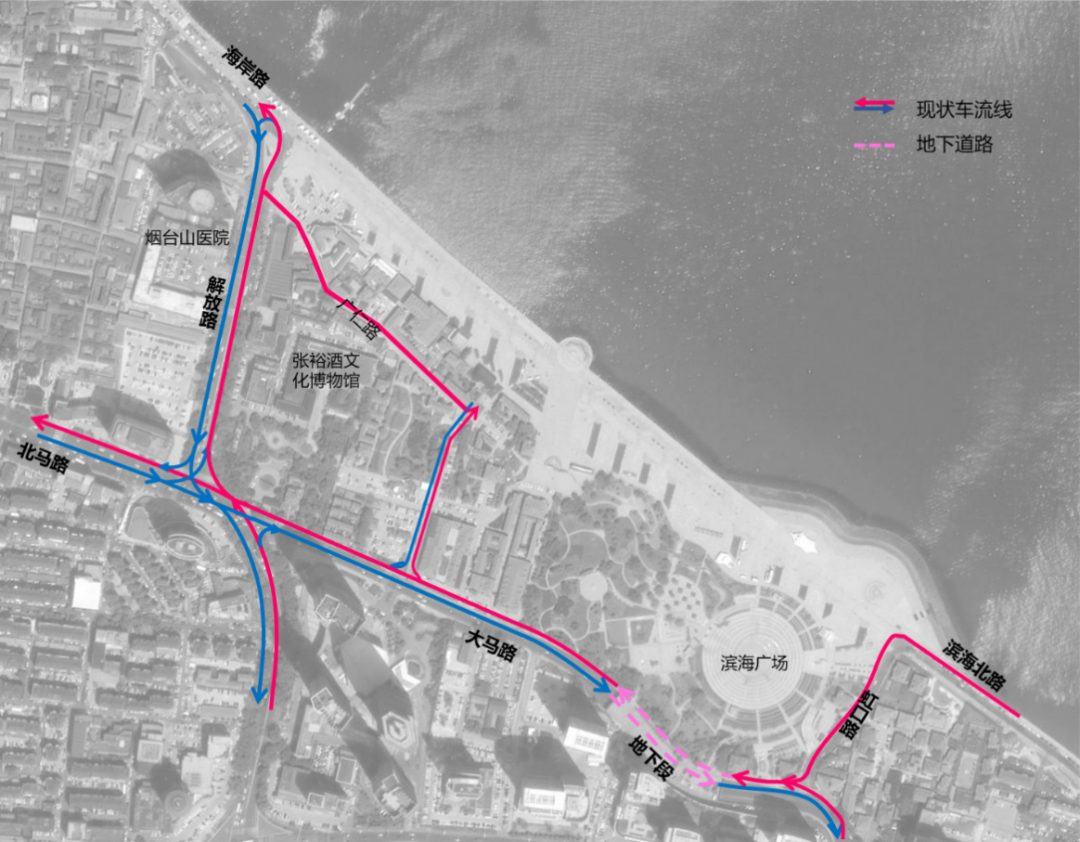 地面辅路:在大马路(滨海广场段)路北新增地面由东向西单行道,解决原地下道路不易到达广场的问题。