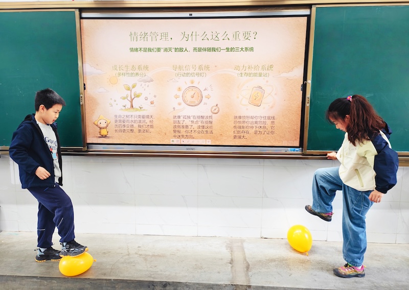 活动依据小学生不同年龄段心理认知规律,分年级设计递进式体验项目,以趣味互动替代单纯说教,让孩子们在欢乐中学会与情绪友好相处。低年级聚焦情绪认知,开展“趣玩情绪万花筒”活动。“情绪盲盒大闯关”环节中,孩子们轮流抽取表情或情境卡片,迅速做出对应表情与动作,在互动中,轻松识别四种基本情绪,筑牢情绪管理基础。中年级以情绪调节为核心,举办“心情游乐园解压派对”。“消灭坏情绪大作战”里,学生将烦心事写进纸条、塞入气球,通过拍打、踩爆等安全方式释放压力;“掌中大脑”深呼吸引导操,让孩子们掌握实用减压技巧,学会从情绪爆发回归理智思考。高年级侧重情绪表达与转化,开展“情绪万花筒•多彩心力量”活动。“解忧树洞”与“解忧锦囊”互换环节,孩子们匿名倾诉烦恼、传递温暖,形成互助共进的集体情感支持圈。